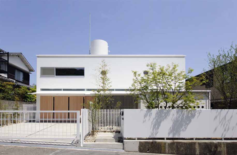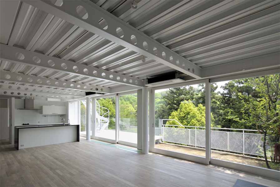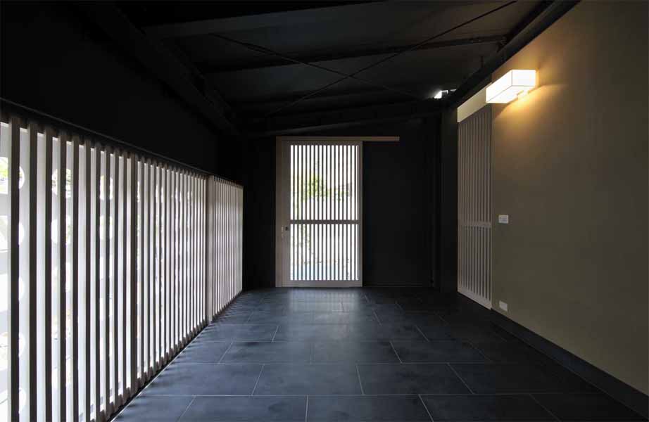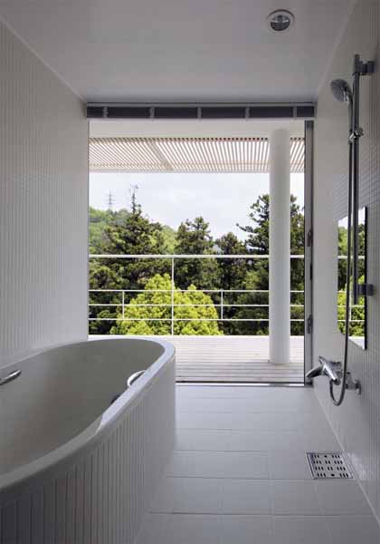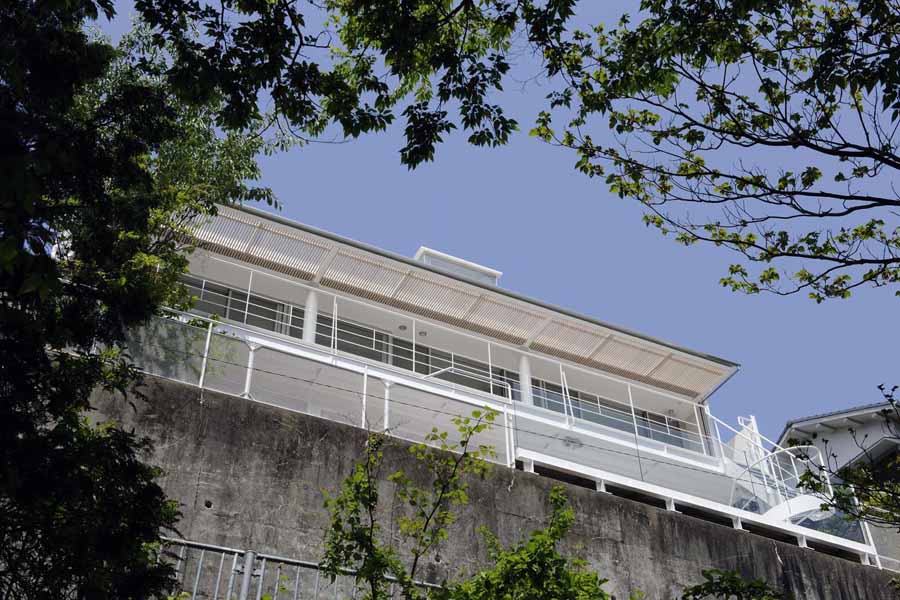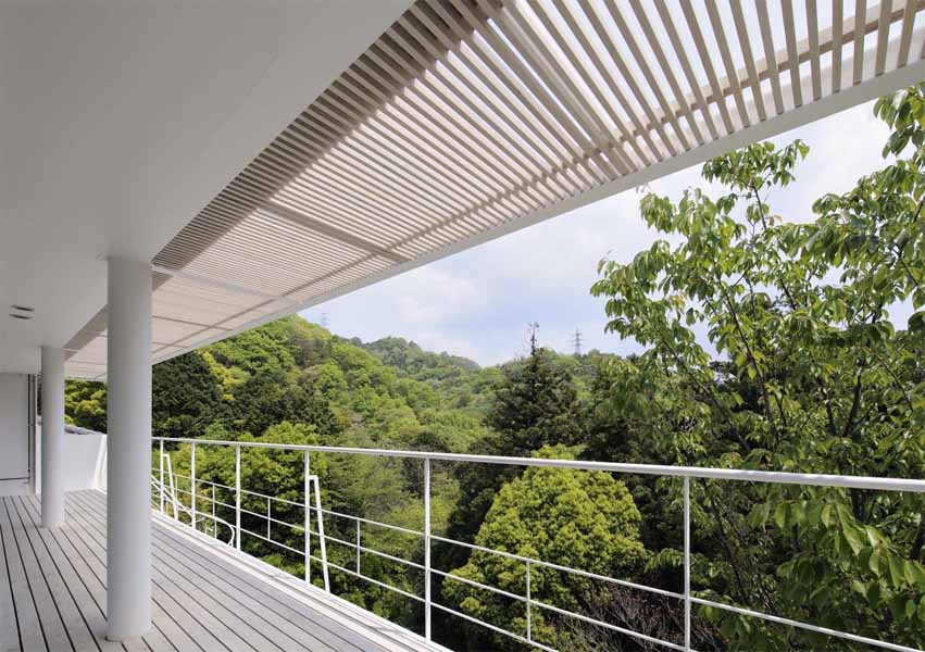 The main characteristics of this house are the deck terraces that open towards the forest. All three floors have large openings and terraces facing the forest on the east side. The overhang on the first floor is made of wooden louvers and glass so that light can reach the lower terrace. In contrast, the entrance hall and “doma” space (space situated at the same level as the ground) on the west side have only few small openings or lattice-windows to keep that part enclosed. This house is a harmonization between openness and calmness.