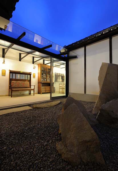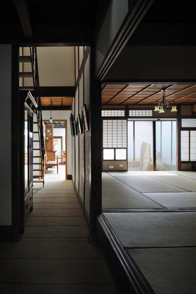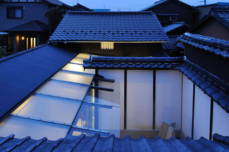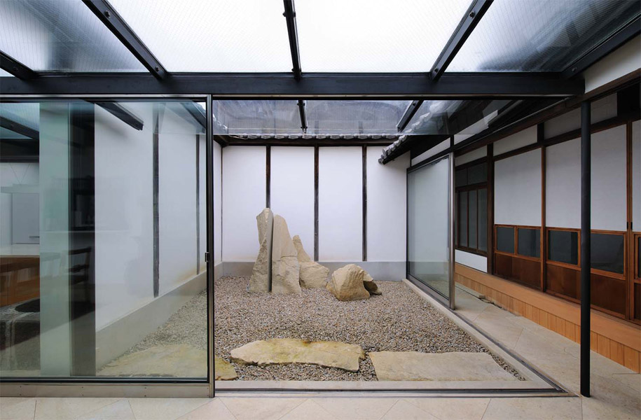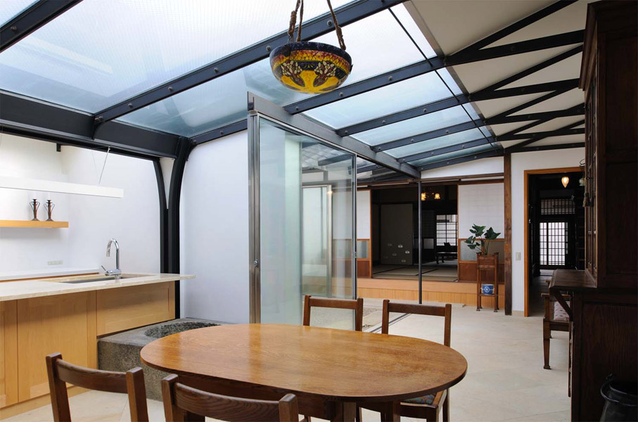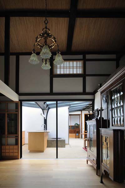 居間となった奥の物置倉庫の傷んでいた建屋は、全面的に構造補強を行い、新たに土間部分の2階の寝室に繋がる階段、木と石とガラスと鉄のフレームで構成されたコンサバトリーのダイニングとキッチンを設けた。そしてこの住宅の最も大切な中心には、地元の竜山石による沈黙の石庭の中庭がある。大正時代の寂れゆく町屋と石庭、そしてアールヌーボーの家具の異質な混成により日本人がいつしか置き忘れてきた雅やかさや物静かな気高い精神性が寂れゆく町家を再び蘇らせた。